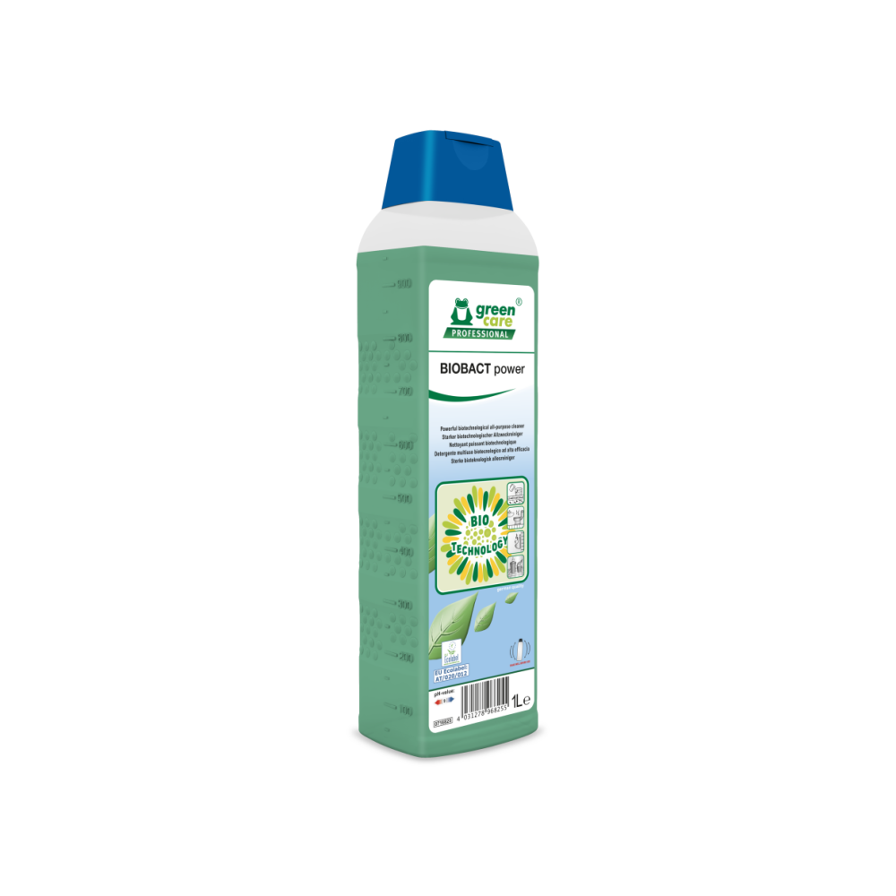 Milieuvriendelijk en zuinig in gebruik Regelmatig gebruik van BIOBACT power voorkomt opbouw van hardnekkig vuil (zoals cellulose, ijzer, eiwit en zetmeel). Vermindert de frequentie en arbeidsintensiteit van het schoonmaken waardoor het efficiënt en tijdbesparend is. Het is een zachte allesreiniger bijzonder geschikt voor gebruik in drukbezochte plaatsen zoals rust- en verzorgingstehuizen, openbare sanitaire voorzieningen, treinstations, afvalverwerkingsbedrijven en andere openbare gebouwen.