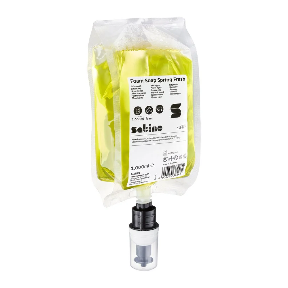 Schuimzeep Spring Fresh 6 x 1.000 ml SF1-compatibel De schuimzeep met volumineuze mousse en delicate geur - voor lichte tot middelzware vervuiling, gemaakt van puur natuurlijke ingrediënten en vrij van allergenen. Zachte reiniging voor de handen en een delicate geur voor een langdurig schoon gevoel. Ook geschikt voor veelvuldig handen wassen zonder de huid te belasten. In een stazakje met geïntegreerd pompje voor optimale hygiëne en snelle vervanging.